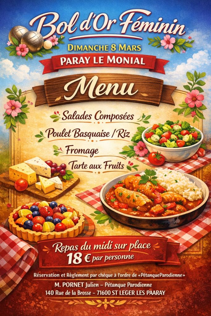 Voici l’affiche du repas organisé à l’occasion du Bol d’Or féminin de Paray‑le‑Monial.
