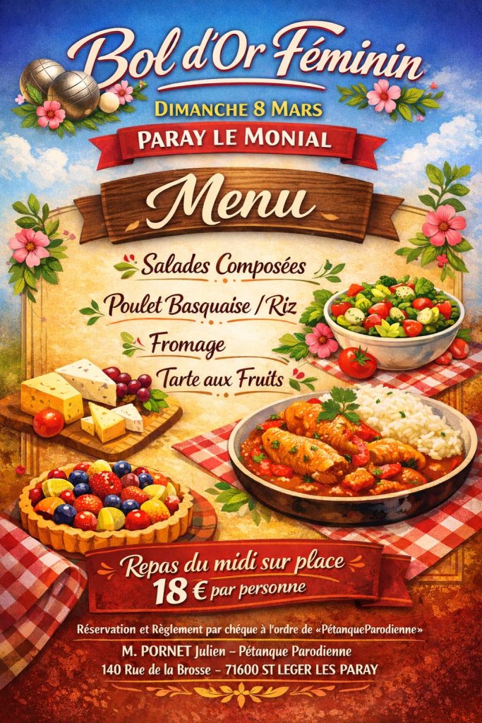 Voici l’affiche du repas organisé à l’occasion du Bol d’Or féminin de Paray‑le‑Monial.