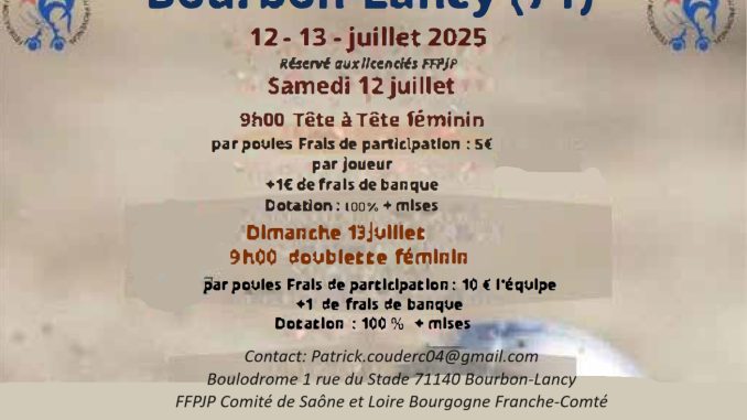 Week-end Bourbon Lancy 12 13 14 Juillet 20 juin 2025 pascal D Non classé 0 Suite à de nombreuses demandes le Club de Bourbon Lancy à ajouter deux concours départementaux pour les féminines