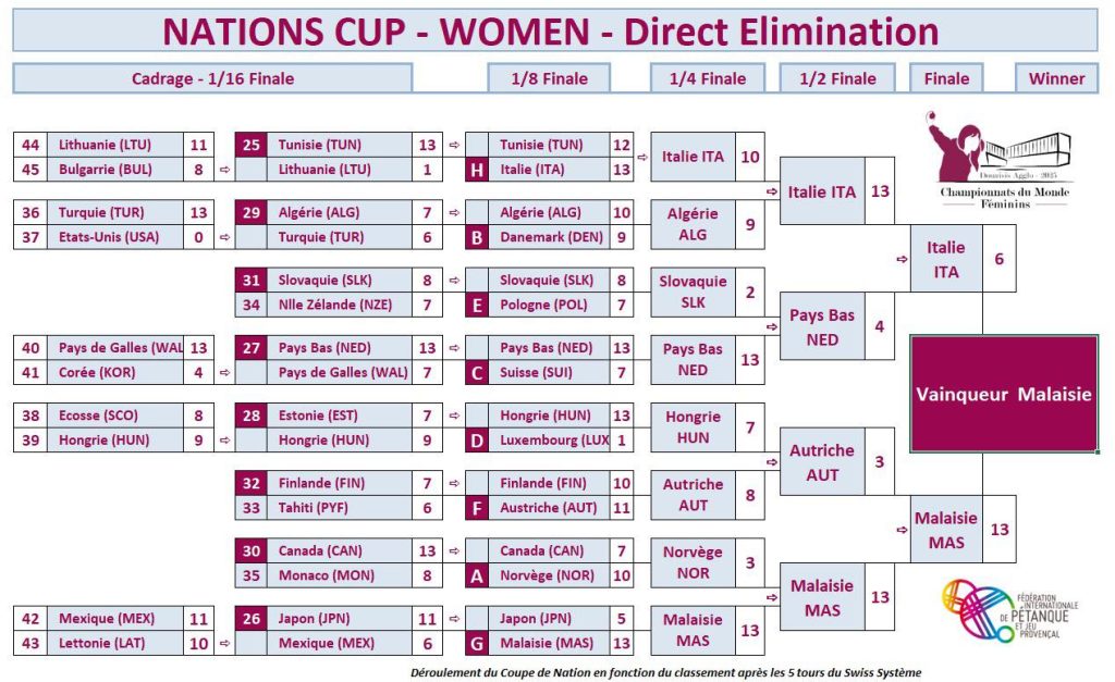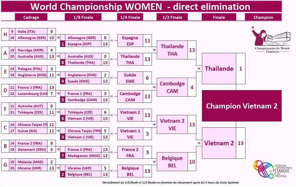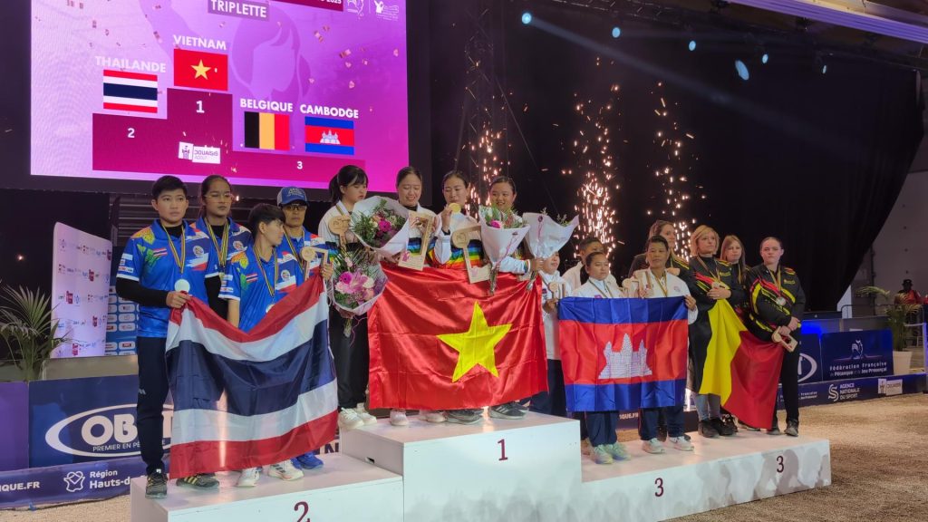 La triplette a confirmé l’emprise asiatique sur la scène mondiale. Le Vietnam 2, emmené par Thi Thi Nguyen, Thi Thuy Kieu Nguyen, Ngoc Nhu Y Le et Thi Dung Lai, a survolé la compétition. Après avoir écarté Vietnam 1 (13-3) puis la Belgique (13-10), les tenantes du titre ont écrasé la Thaïlande en finale (13-1). Le Vietnam conserve ainsi sa couronne avec un groupe partiellement renouvelé, mais toujours aussi impressionnant.