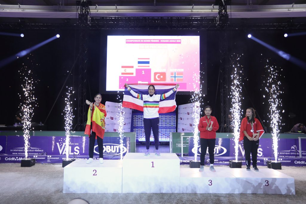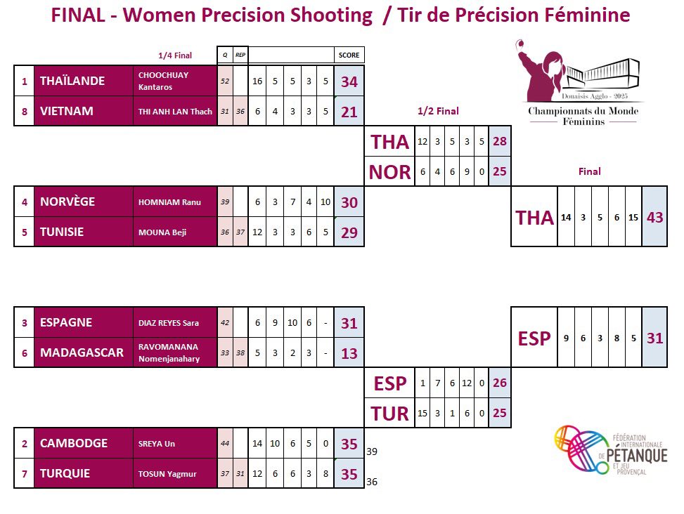 Dès l’ouverture, la Thaïlandaise Kantaros Choochuay a imposé sa loi. Intouchable de bout en bout, elle a remporté la finale face à l’Espagnole Sara Dias Reyes (43-31), signant son troisième titre mondial après ceux obtenus en doublette et en tête-à-tête. Avec 52 points en qualifications, son niveau d’exécution a écarté toute concurrence. Côté français, Aurélie Bories a été éliminée dès les qualifications, preuve des difficultés tricolores dans une épreuve devenue d’un très haut niveau technique.