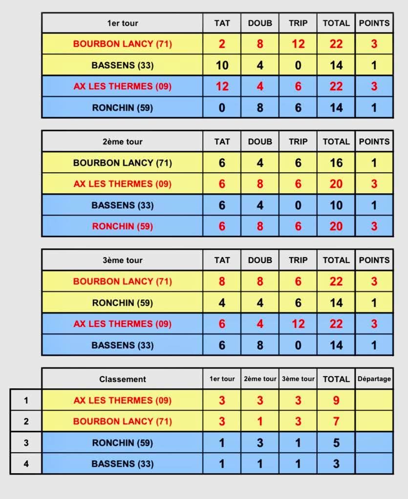 La dernière étape offrait des retrouvailles avec Ax-les-Thermes. Le départ fut encore compliqué, avec seulement deux tête-à-tête remportés, mais les doublettes ont rétabli l’équilibre. À égalité parfaite avant les triplettes, Bourbon a alors fait le job avec autorité : deux victoires simultanées, 13-6, pour conclure en beauté et décrocher un nouveau titre de champion de France des clubs, sept ans après celui de 2018.