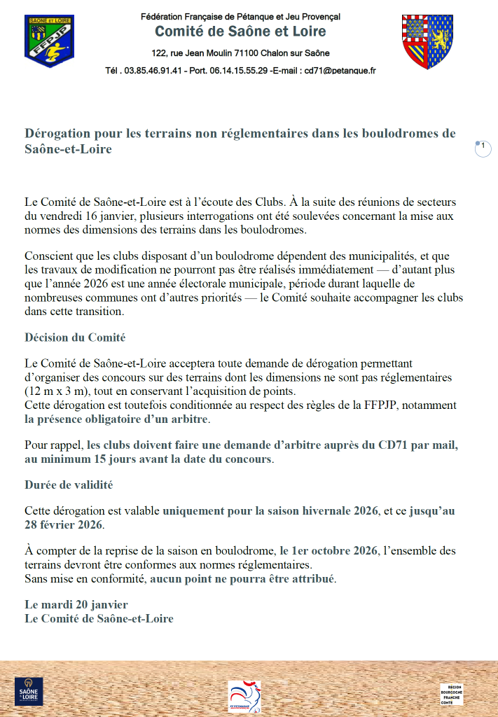 Dérogation pour les terrains non réglementaires dans les boulodromes de Saône‑et‑Loire 20 janvier 2026 pascal D Non classé 0